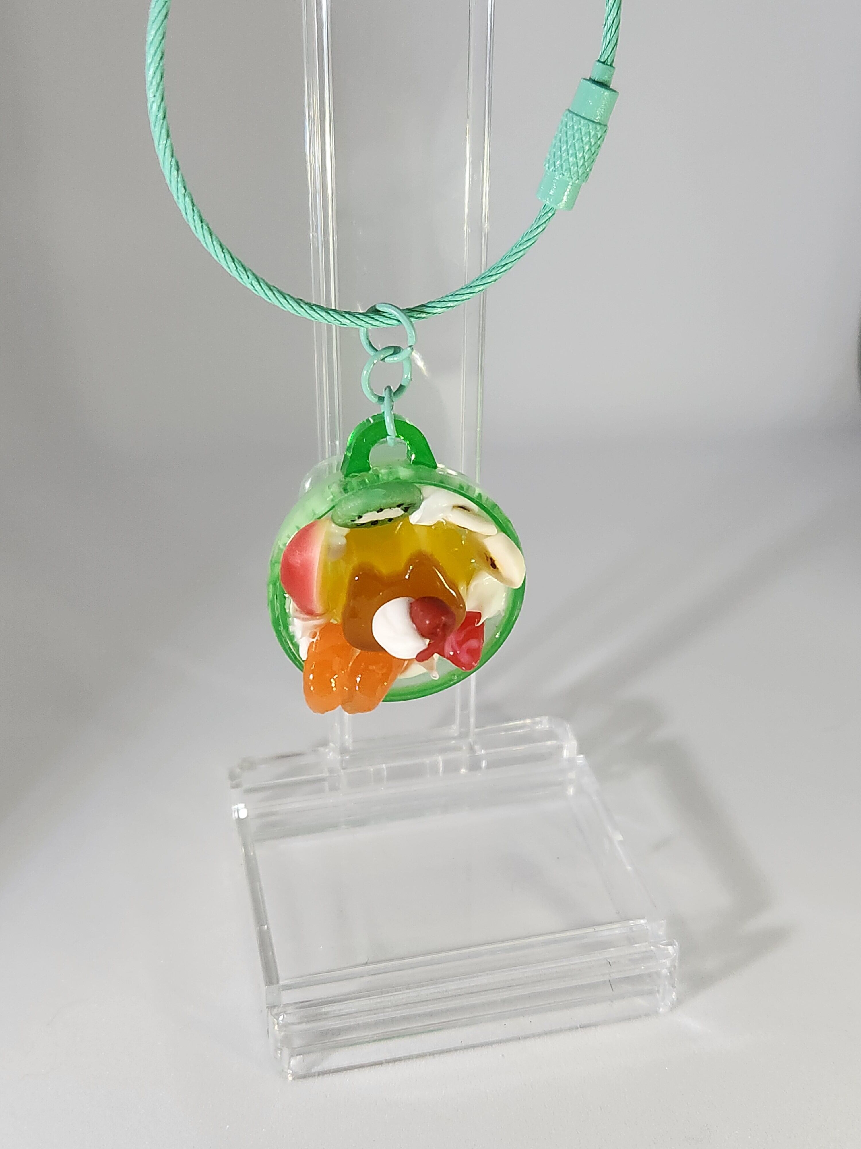 猫の形のプリンをフルーツやホイップクリームでデコレーションしたプリンアラモードのワイヤーキーホルダーです 鍵につけてもバックにつけても可愛いです